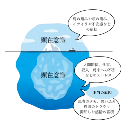 - 水面上(顕在意識・症状): 肩こり、頭痛、めまい、不眠、イライラ、やる気が出ない……。これらは「結果」として現れているサインです。